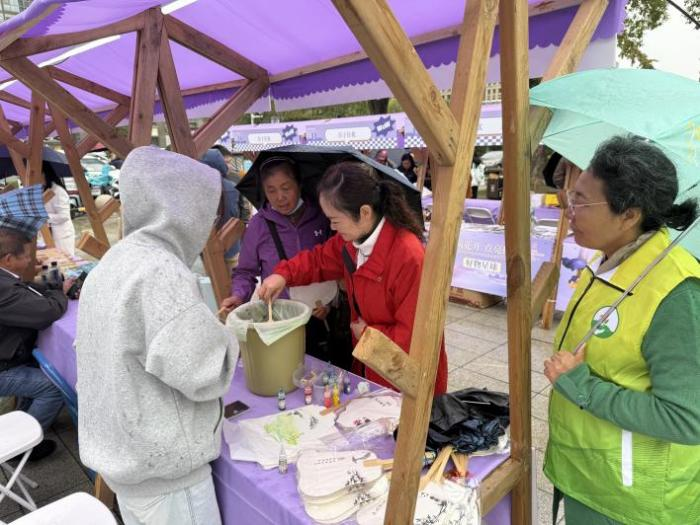 活动现场,尽管细雨朦胧,却丝毫未减大家的热情。在“积木拼图”“手绘扇面”等互动摊位前,计算机工程学院的志愿者们协助工作人员引导居民参与,与社区群众一同在创意互动中感受文化乐趣。舞台上,乐队表演、文艺节目轮番上演,紫色灯光与雨中的伞海交相辉映,构成了一幅独特的城市文艺图景。计算机工程学院的学子们或在现场维持秩序,或作为观众沉浸式欣赏演出,在文艺氛围中深化对社区文化的感知。