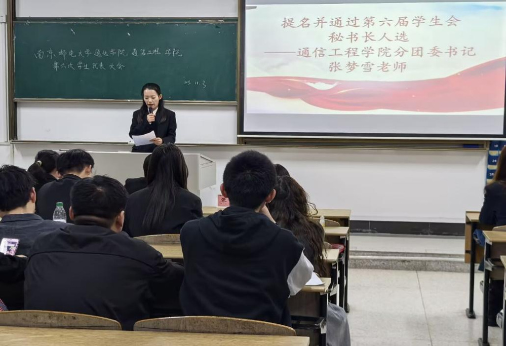11月3日晚,南京邮电大学通达学院通信工程学院第六次学生代表大会在扬教1307召开。党总支书记司艺、分团委书记张梦雪,通院学生会成员及全体学生代表出席,大会由学生会执行主席李心语主持。
