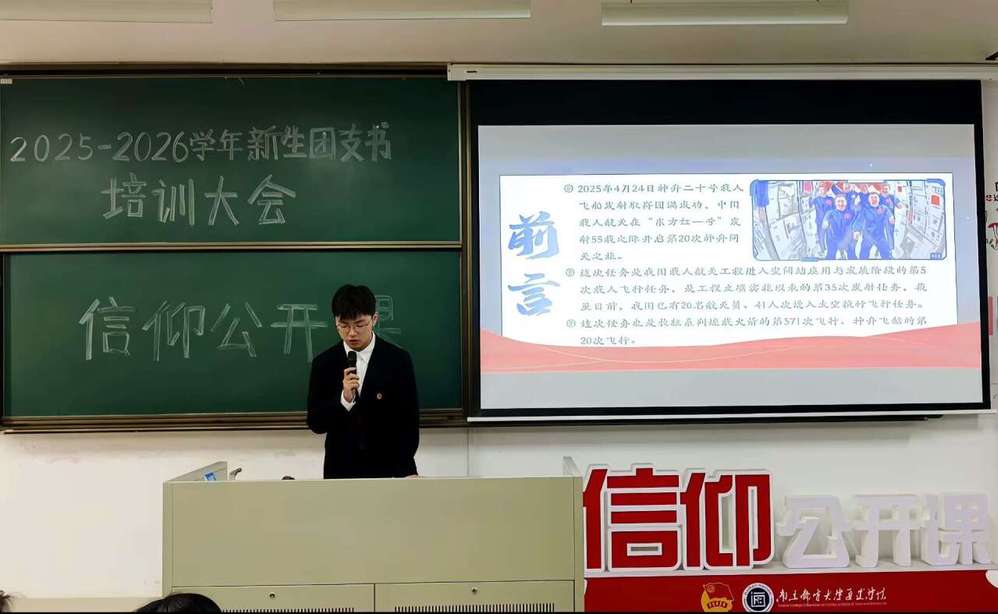 在经验分享环节,优秀团支书代表裴依娜、周崔游结合自身工作实践,围绕团日活动策划、日常团务精细化管理等内容展开分享,通过鲜活案例展现了支部在思想引领深化、基础团务落实、实践活动创新中的亮眼成果,为新生团支书提供了可借鉴的实操方案;青马工程优秀学员刘畅分享了在“青马工程·大学生菁英人才班”的培训收获与工作感悟,从理论学习与实践结合的角度,为新生团支书传授了青年思想引领与团队凝聚的工作方法;团委兼职学生副书记邱涛以《问天揽月 逐梦苍穹》为题带来信仰公开课,深度解读新时代载人航天精神的丰富内涵,引导在场青年从航天人“追光逐梦、矢志探索”的征程中,汲取爱国情怀与奋斗力量,让信仰之光照亮青春之路。