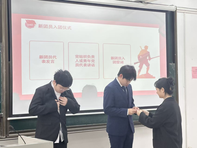 仪式在庄严的《光荣啊,中国共青团》歌声中开始。分团委书记张梦雪老师勉励新团员牢记身份、践行使命。分团委学生副书记张榆婕阐述入团仪式的时代意义,并为新团员佩戴团徽。新团员面向团旗庄严宣誓,铿锵誓言彰显着矢志不渝跟党走、勇担时代重任的坚定决心。优秀团员代表刘方上台发言,鼓励新团员以入团为新起点,严守团的章程,履行团员义务,在学习实践中锤炼品格,成长为新时代好青年。
