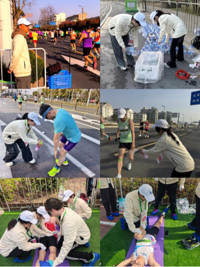 凌晨四点,天色未亮,我院志愿者们已整装集结、精神抖擞,带着期待与责任奔赴各自的服务岗位。在此之前,大家已完成了系统性的通识与专业培训,从岗位职责、物资分发到应急处置,每一项内容都了然于心。抵达各站点后,在裁判老师和带队老师的指导下,志愿者们迅速投入工作,有序整理补给物资,以严谨细致的姿态迎接选手的到来。赛道旁,志愿者们各司其职、贴心护航:肌肉舒缓组在医师指导下,为选手提供赛中赛后放松,用专业喷雾缓解疲劳、保障状态;喷淋降温组坚守沿线,及时为跑者降温补水、维持体能;感应计时组协助铺设感应毯、精准记录成绩,同时维护秩序、保障赛道畅通;终点拉伸组为完赛选手提供专业拉伸指导,助力快速恢复。与此同时,递水补给、呐喊助威的身影也随处可见,一声声“加油”与跑者的真挚回应相互交织,成为赛道旁温暖动人的风景线。