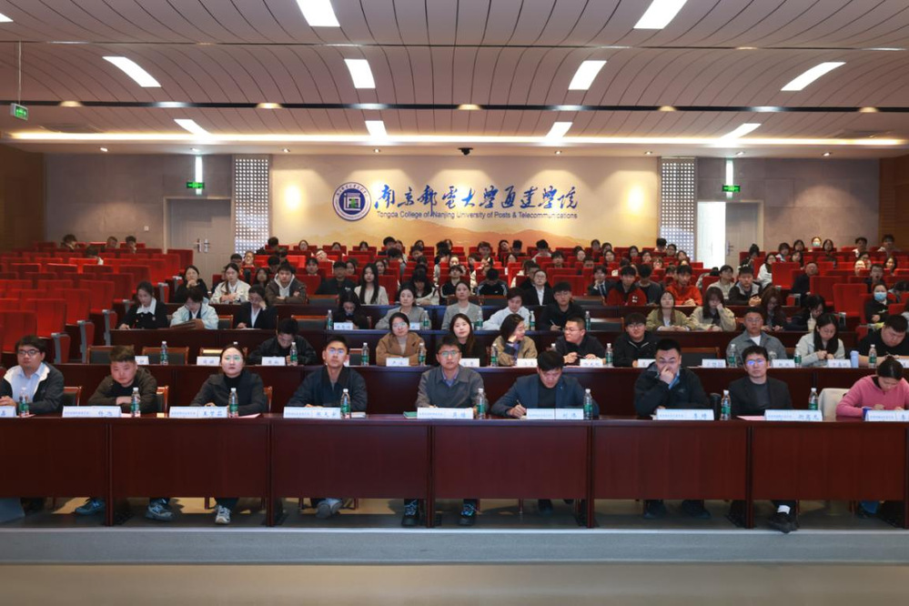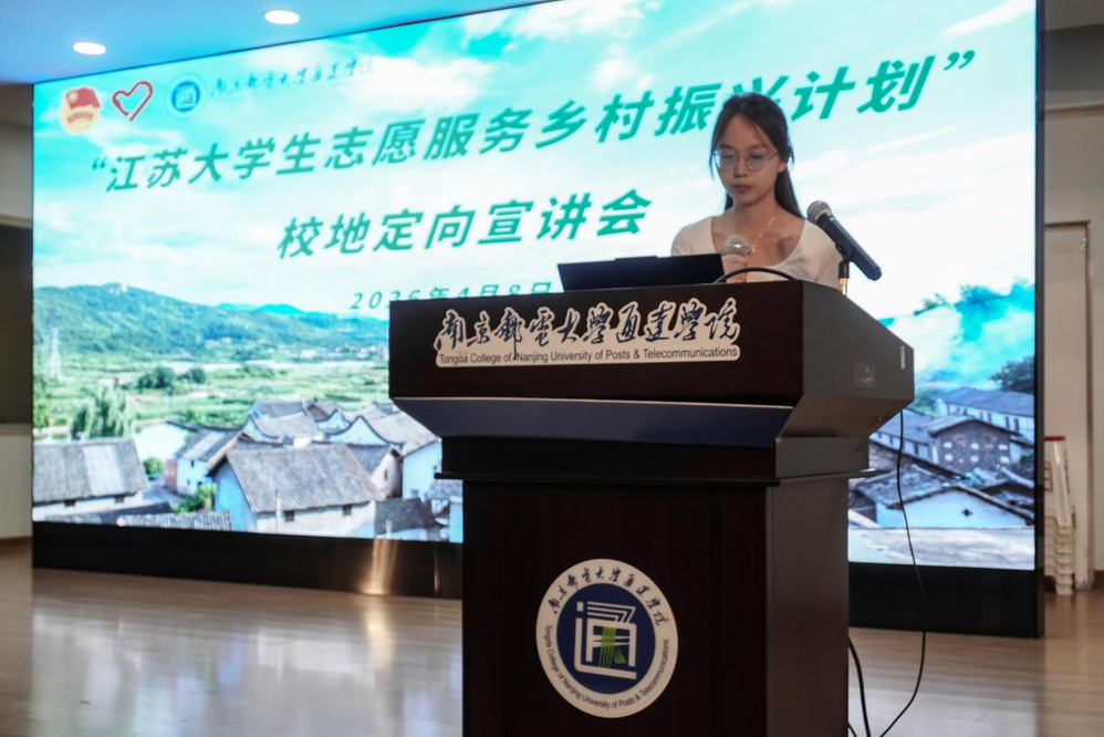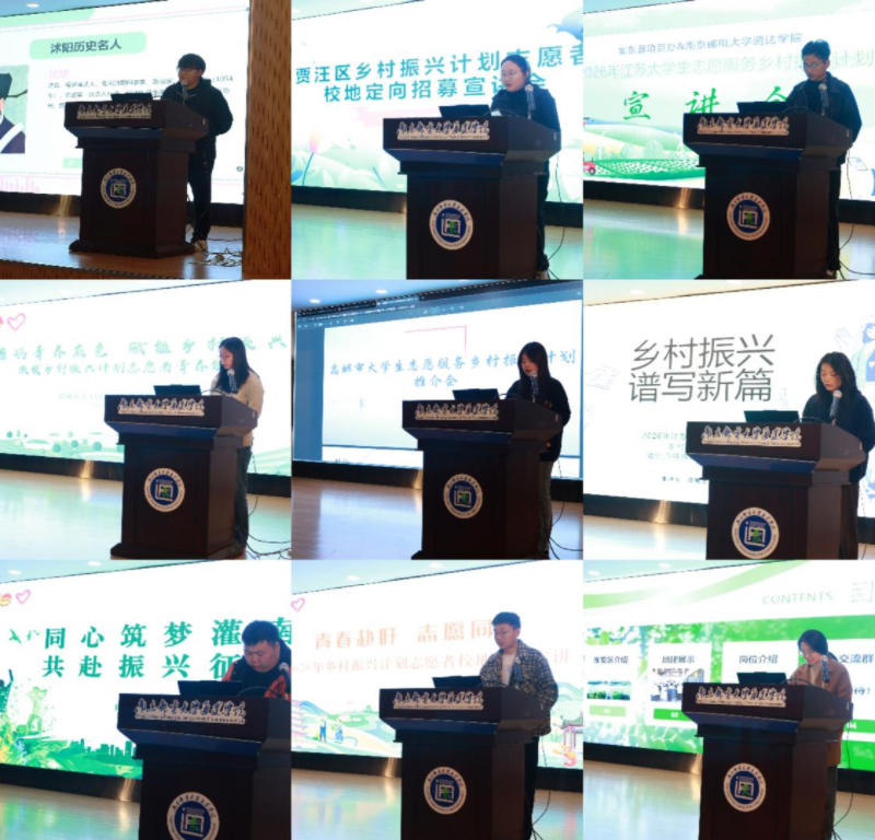 4月8日下午,2026年“江苏大学生志愿服务乡村振兴计划”校地定向宣讲会在我院实验楼报告厅顺利举办。学院党委副书记兼副院长刘伟、宿豫区团委副书记衡奕龙、高邮市团委副书记吴瞳,大丰县团委副书记李琦,如东县团委副书记张天宇,贾汪区团委项目办主任王梦茹,淮安区团委青发部部长李春蓉,沭阳县团委七雄街道宣传统战科科长杨旭,盱眙县团委学少部负责人王国凡,灌南县团委社联部部长谢鑫以及江苏各区县相关人员出席。会议由学院学生团委副书记王玉玲主持,团委全体老师和毕业班师生代表参加本次会议。